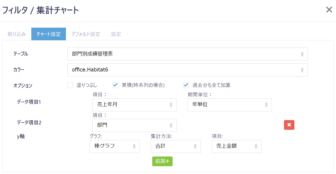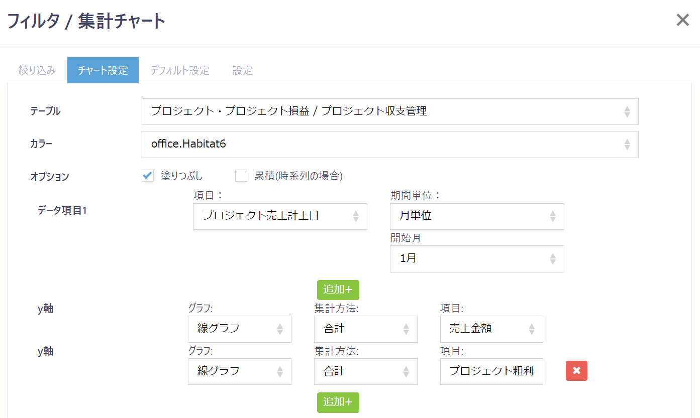 | y軸(集計方法) | y軸で表示する項目の集計方法を選択します。 |