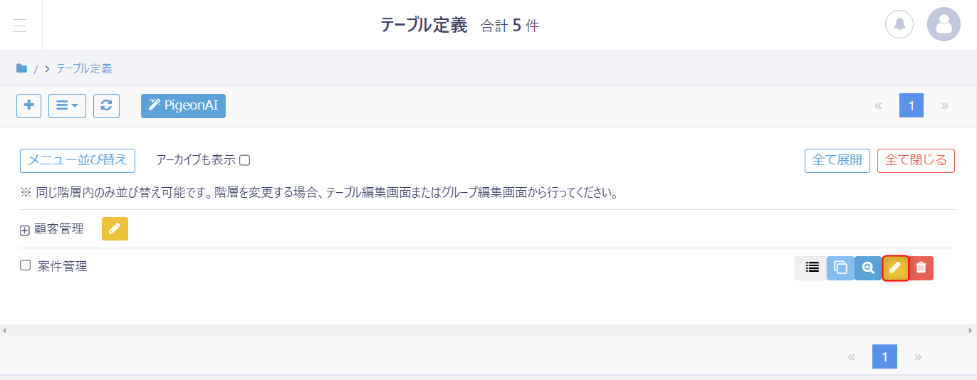 テーブル名の横に表示されている「鉛筆」ボタンをクリックし、テーブルの編集画面を開きます。