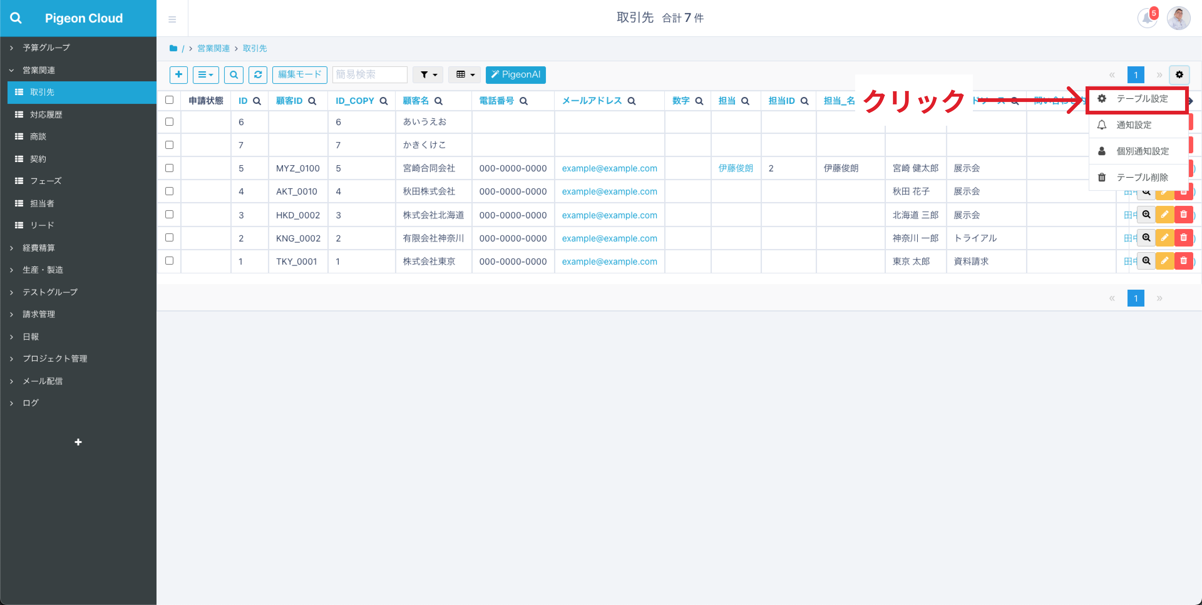 メニュー内の「テーブル設定」と記載のボタンをクリックしてください。