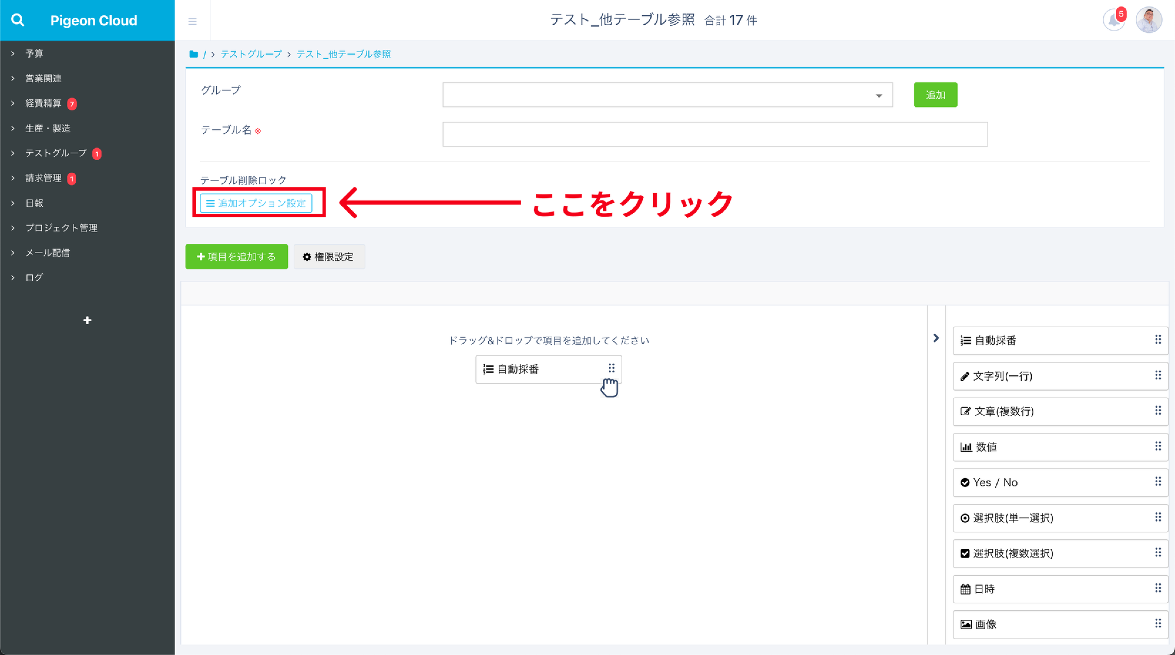テーブル設定ページの画面上部のボックス内下部にある「追加オプション設定」という青い枠のボタンをクリックしてください。