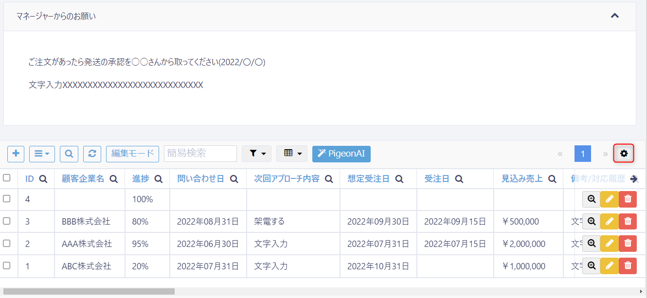 画面右上の「歯車」アイコンをクリックし、テーブル設定画面を開きます。