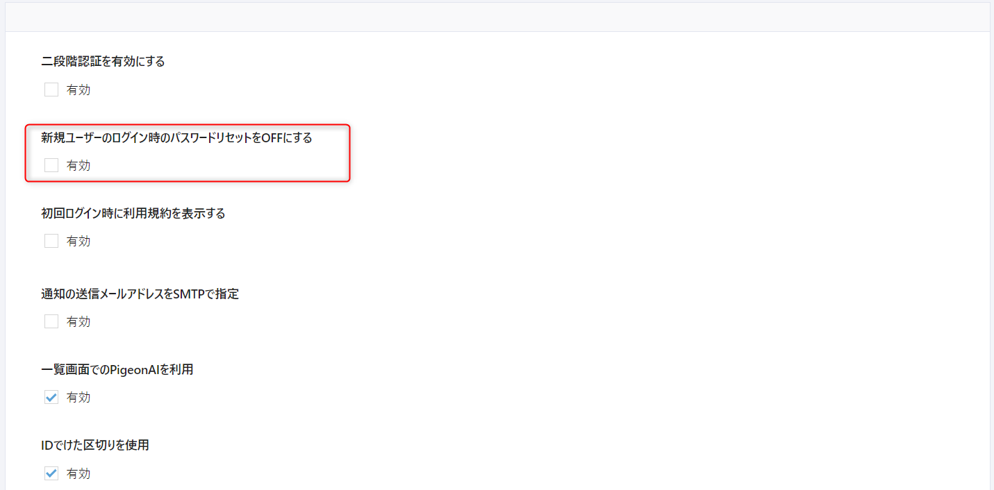 「新規ユーザーのログイン時のパスワードリセットをOFFにする」の欄に表示されている「有効」チェックボックスにチェックを入れます。