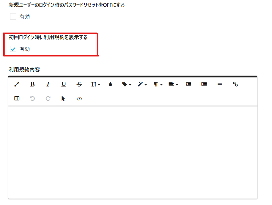 「初回ログイン時に利用規約を表示する」の欄に表示されている「有効」チェックボックスにチェックを入れます。