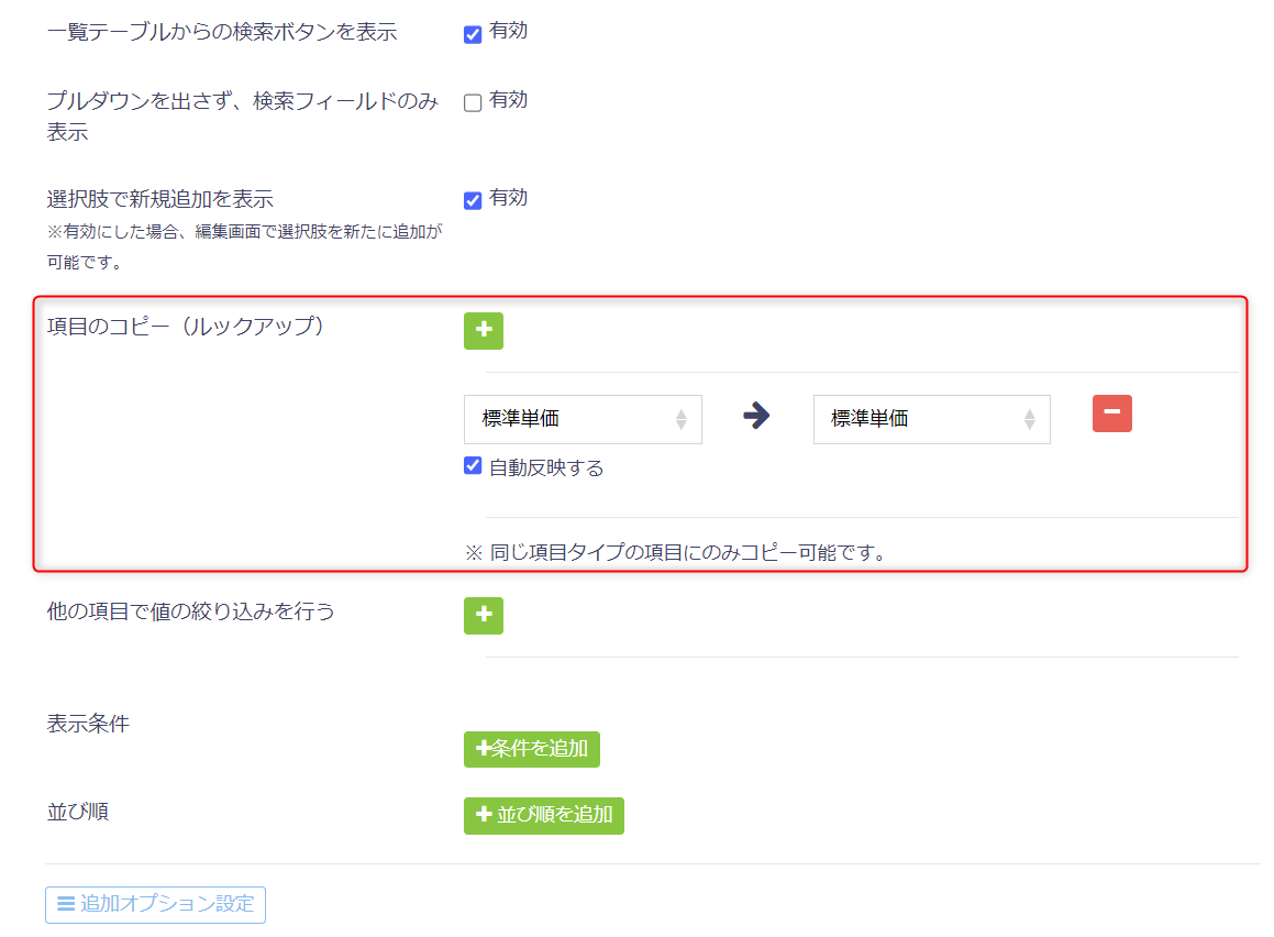設定画面下部分の「項目のコピー(ルックアップ)の部分で、以下の設定を行います。