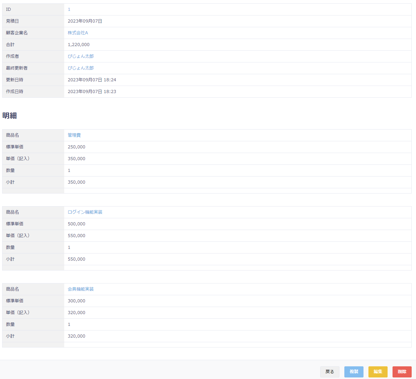 PigeonCloudでは、他テーブル参照機能や計算式の項目を使うことで、選択したサービス商品の標準単価の設定や、余剰分(見込み利益)等を積み上げた合計額の計算等を自動計算することができます。