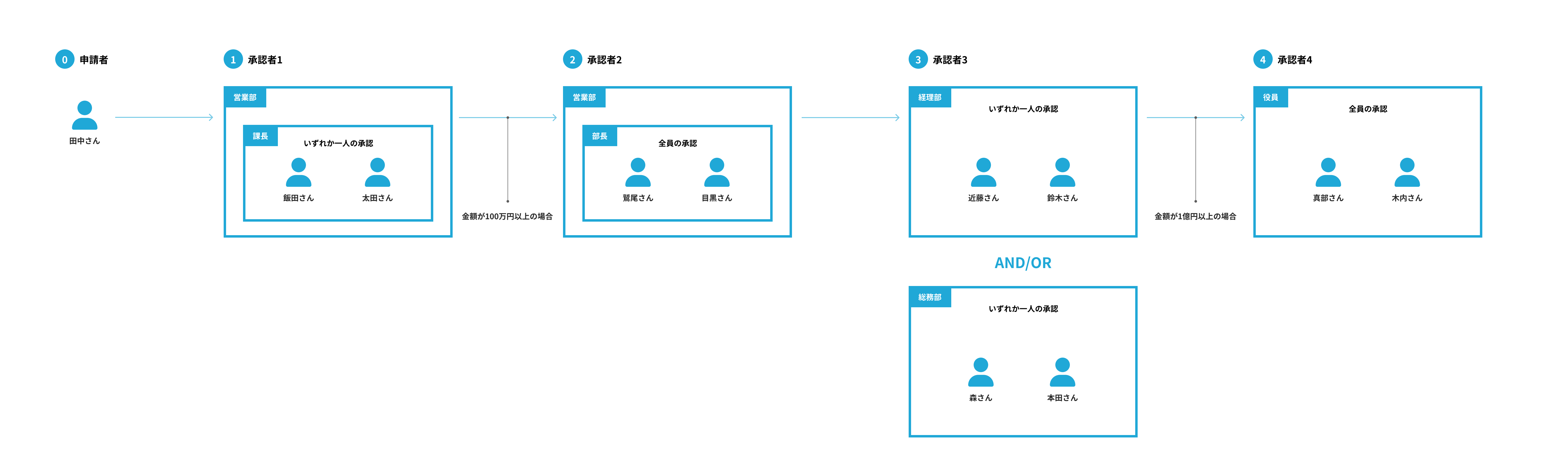 例えば、以下の画像の承認者3から承認者4に対して承認依頼の申請を送る際の条件を、金額が1億円以上の場合に、申請の金額が9,999万円であれば承認者4の承認者スキップされ、金額が10,000万円 (1億円) であれば承認者4に申請が届くようになります。